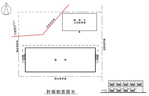 - 残地に機械式立体駐車場を設置する事は可能です。また、実態調査の結果、近隣に機械式立体駐車場を保有するアパ−トは20%程度でしたが、分譲マンションには度々見受けられ、共同住宅の駐車場が機械式であることによる入居者の減少はないと判断しました。