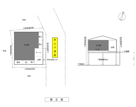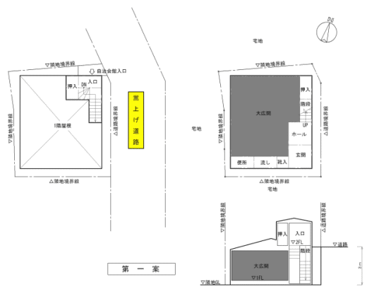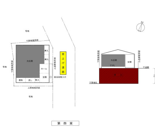 現在の敷地全体に土を盛り、嵩上げされた道路と同じ高さにした後に、建物を建築する案です。