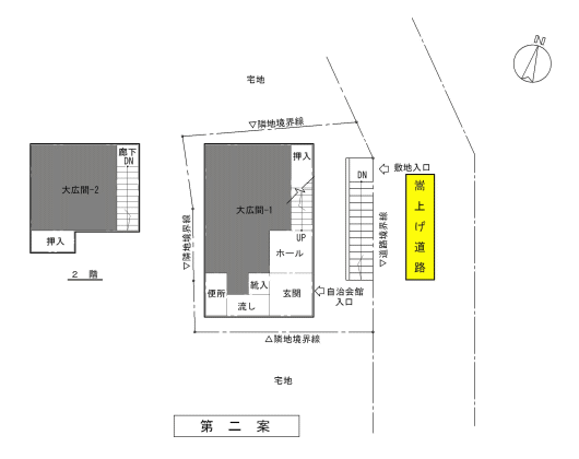 第二案は建物の面積の確保は可能ですが、大広間が二分されることは本来の用途の機能回復にはなりません。