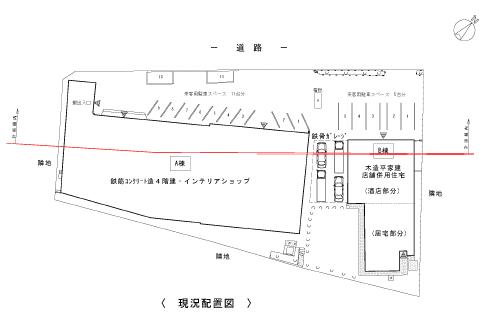 A棟インテリアショップは構外に移転します。B棟併用住宅は現況の形状で残地に再配置が可能なため曳家工法とします。