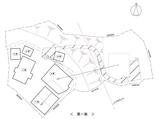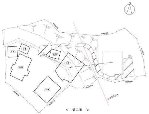 傾斜地を利用し、切り土工事により土地を有効利用する案は、第一案と比較し、経済的にも合理的であり、B〜F棟の機能に変化が及ぶことはありません。従って、本件は第二案が採用案になりました。