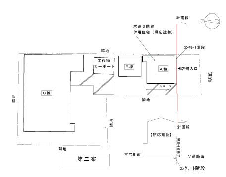 第一案では、住環境と営業形態の機能面に問題点が残りました。第二案ではその問題を解消する案を検討します。