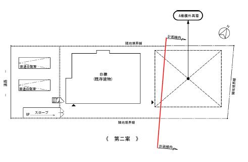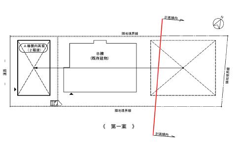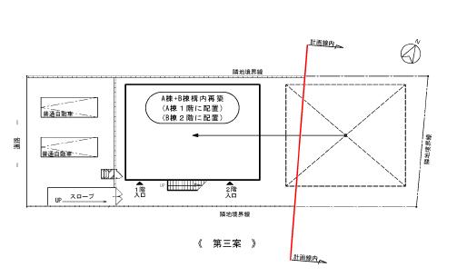 直接支障となるA棟の移転先を駐車スペ−スに求めます。A棟の形状を変えずに再配置するのは有形的に困難なため、2階建てとして建築する案です。B棟は直接支障にならないため移転対象外とします。