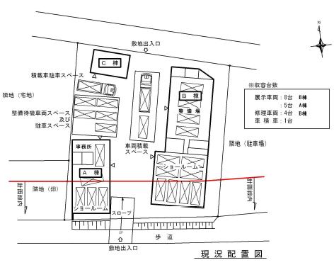 - 敷地内に存する3棟の用途(ショールーム、事務所、整備場、部品・工具等倉庫)は営業上一体となって機能していること。