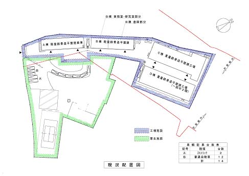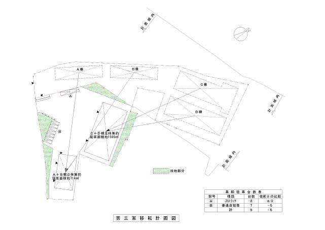 敷地内の4棟ある建物のうち、C棟、D棟の工場2棟とB棟の事務所部分を従前と同じ形状で残地に建築し、B棟の倉庫部分とA棟倉庫を別の敷地へ建築する案です。