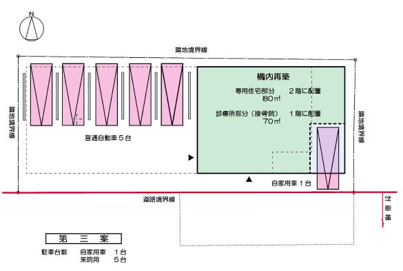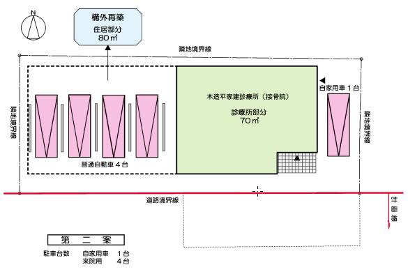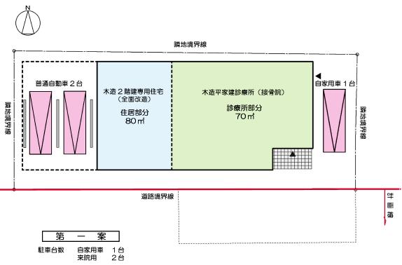 | 診療所部分はそのままで住居部分を構外に移転し、住居跡地に来院用駐車場を設置する案です。 |