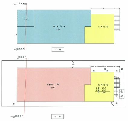- 1階は所有者が経営する法人の事務所・工場と1世帯の賃貸共同住宅として使用され、2階は所有者住居と1世帯の共同住宅として使用されています。