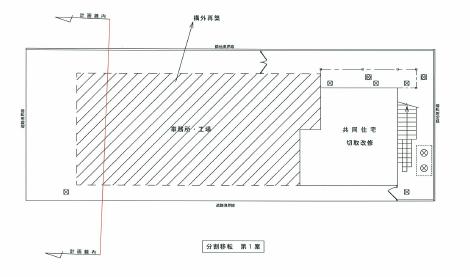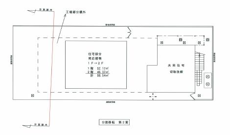 賃貸共同住宅部分を構外移転し、所有者住居及び事務所・工場を残地内に曳家、切り取り補修する案です。