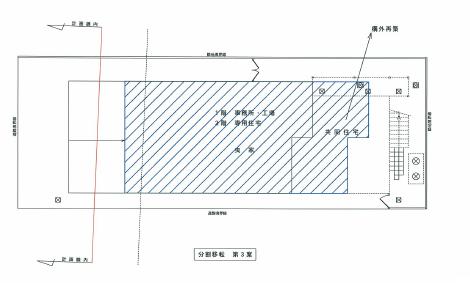 | 当該建物を残地内に現状の形状のまま再築することは、建築基準法上容積率がオーバーになるため、現在の建物、機能を全て残地に移転することは出来ません。建物の用途が所有者住居部分、所有者の事務所・工場部分、共同住宅部分の3つに分かれていることから、本件の移転工法は分割移転を前提として検討を行います。 |