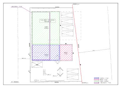 従来の2階建の建物を3階建(1階鉄骨造作業所、2階木造事務所、住居、3階木造住居)の照応建物として敷地北側に建築します。